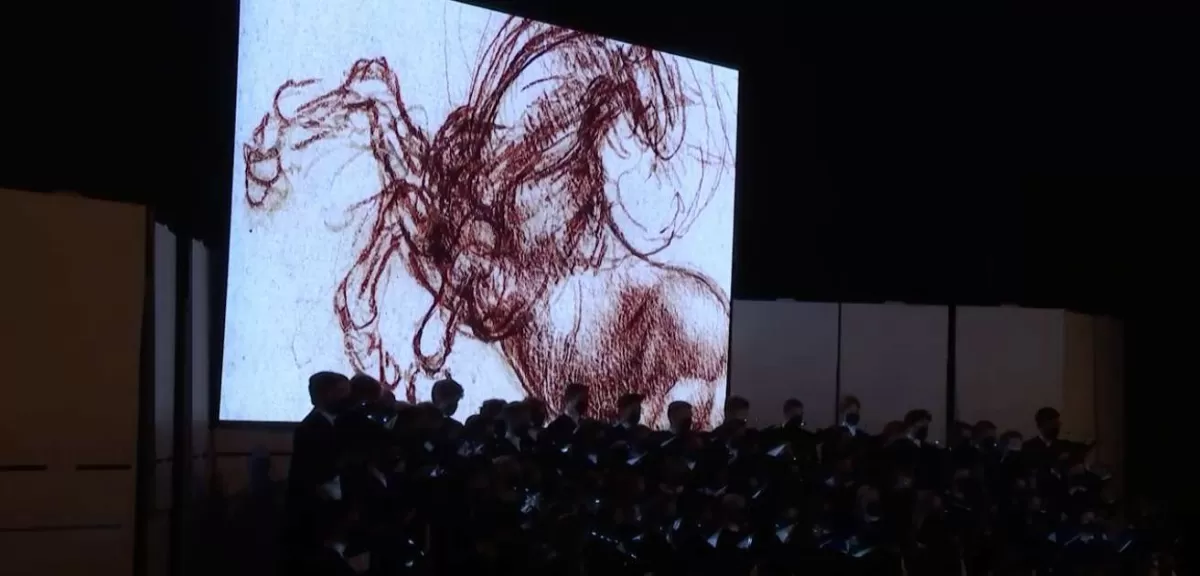 Leonardo da Vinci did not invent the Vitruvian man, but it is without doubt the most recognizable image from all his notebook pages. Vitruvius, the architect, described the human figure as being the principal source of proportion among the classical orders of architecture. Da Vinci was one of several artists who examined this theory by sketching a “Vitruvian man.” The infamous image demonstrates the blend of mathematics and art as well as da Vinci’s deep understanding of proportion. In the fifth movement you will hear the choir sing the different ideal proportions of the human body and see an overlay of his incredibly detailed (and accurate!) sketches of the human form on top of a live model: dancer Stephen Schroeder.