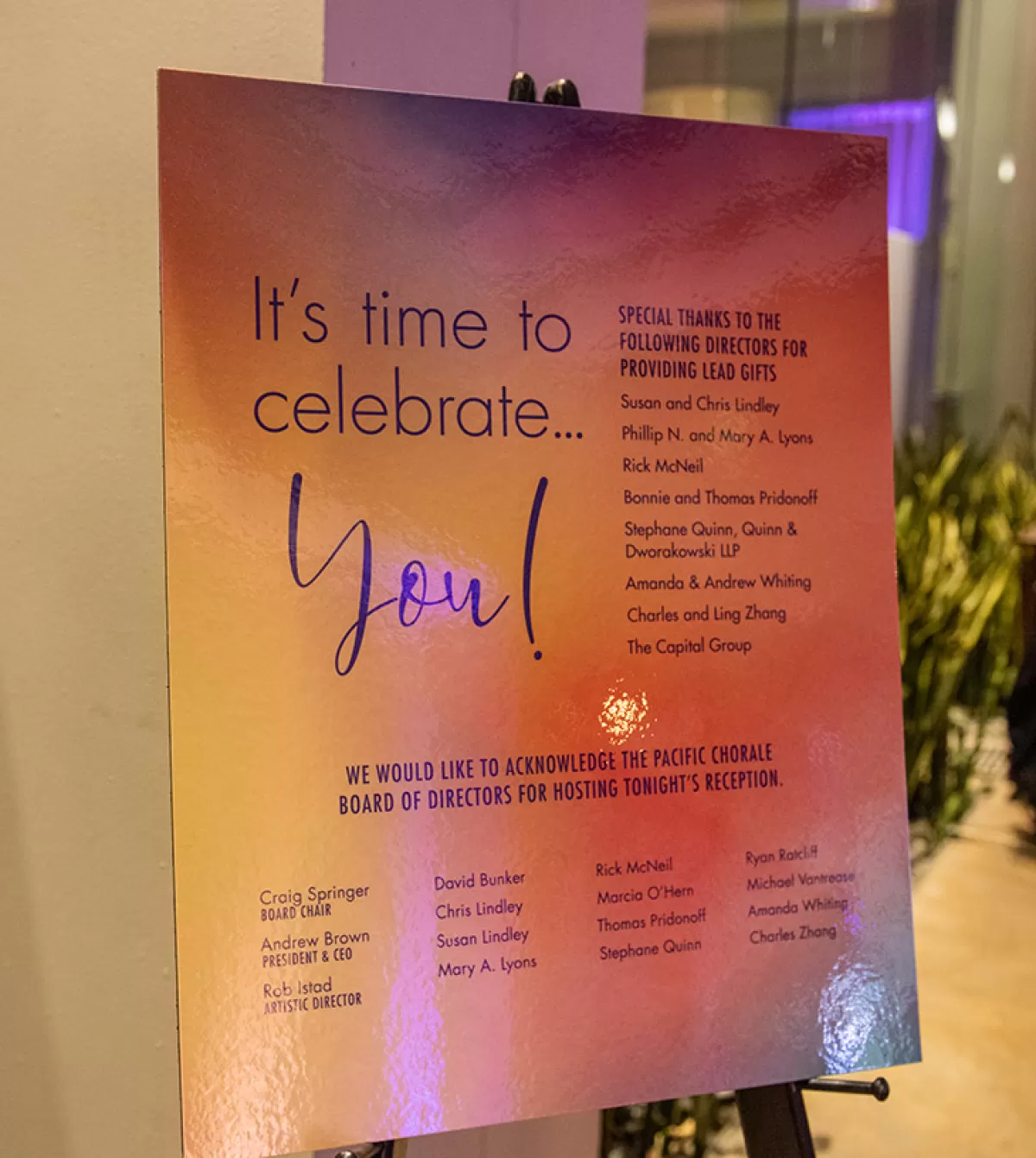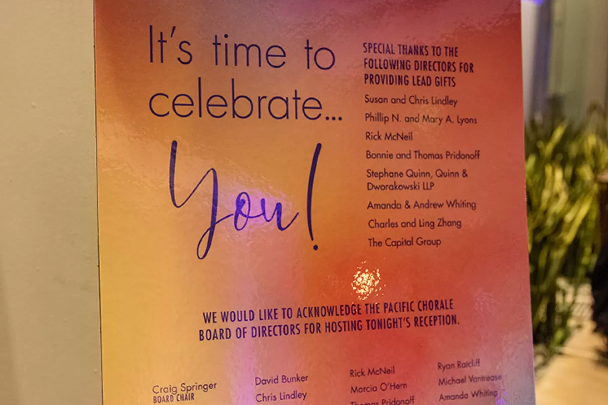 We would like to acknowledge the Pacific Chorale Board of Directors for hosting the reception. Special thanks to the following Directors for providing lead gifts: Susan and Chris Lindley, Phillip N. and Mary A. Lyons, Rick McNeil, Bonnie and Thomas Pridonoff, Stephane Quinn, Quinn & Dworakowski LLP, Amanda & Andrew Whiting, Charles and Ling Zhang, The Capital Group.